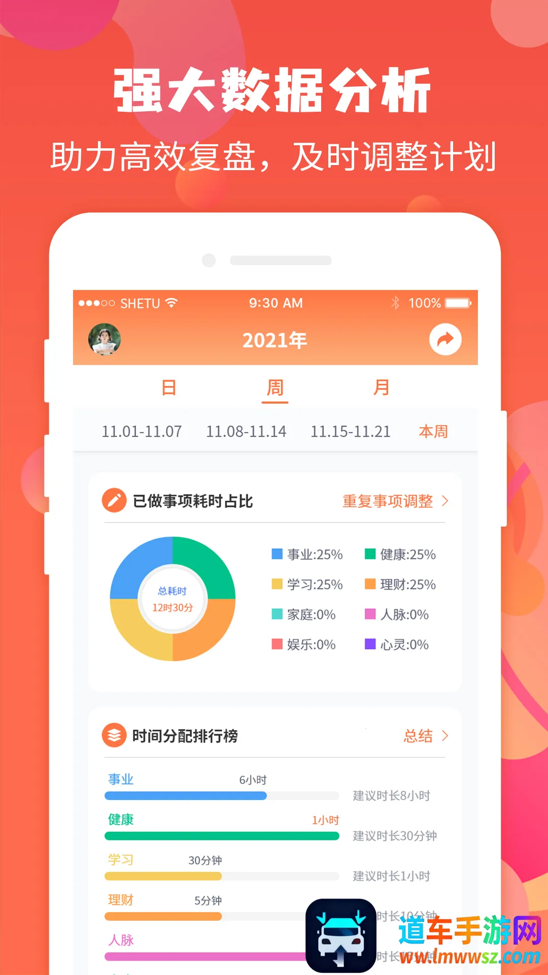4. 可视化视图呈现:具有充实率提示的日视图、周视图、月视图,让用户能直观了解时间利用情况。