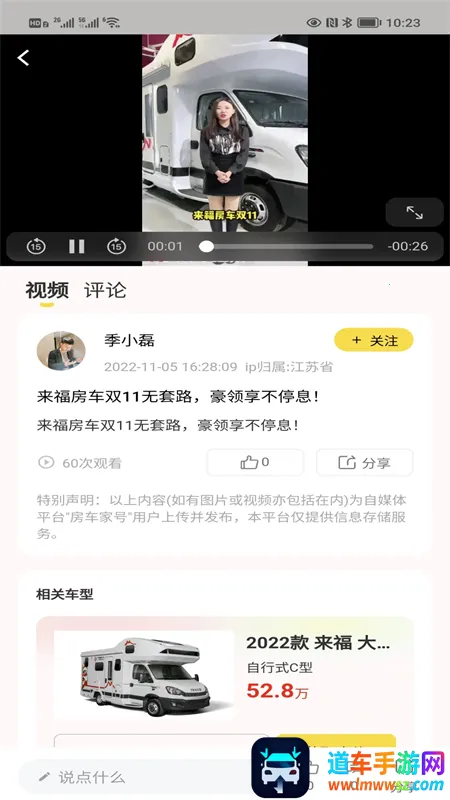 2. 便捷分享:任意一则房车资讯可随时分享给好友,还能一键分享资讯挂车,方便与他人交流。
