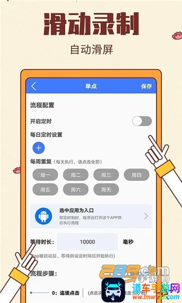 在游戏里,能帮我们实现自动化操作,轻松应对复杂关卡;购物时快速秒杀心仪商品,不错过任何优惠。它支持设置点击路径、频率、时间等,还能自由选择单点或连点模式。其录制器功能超实用,通过手势录制就能复制并循环运行特定手势,完成复杂操作。而且它具有可调节的连点速度和间隔时间,能根据不同需求灵活调整。使用也很方便,在手机系统设置里赋予权限,开启悬浮窗和辅助功能就行。有了它,就能告别枯燥的重复性操作,让手机自动完成相应指令,节省时间和精力,真的太赞啦!赶紧下载体验吧!