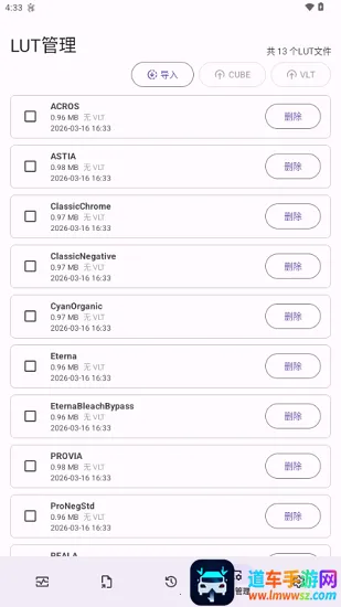 1. 支持多格式导入:可多选导入Lut文件,支持.cube和.vlt格式,并自动转换为33位LUT。