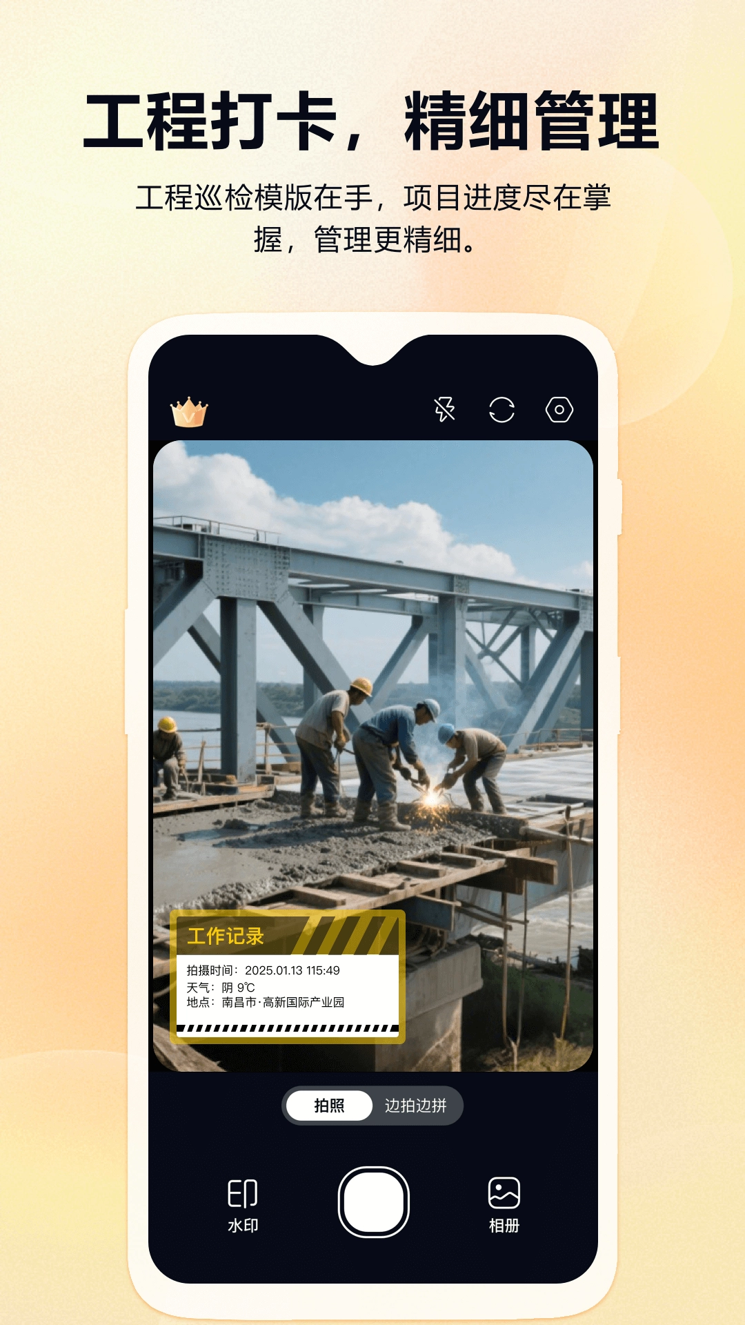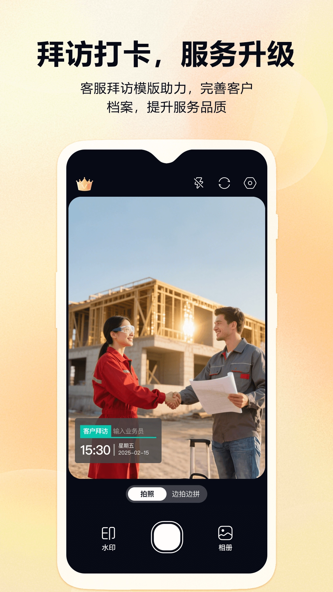 真实时间水印相机考勤打卡最新手机版优势显著。操作流程简便,员工打开应用就能快速记录工作信息,自动生成含关键内容的电子凭证,提升工作效率。支持照片与视频两种打卡模式,可灵活切换。配备智能 AI 美化引擎,自动优化拍摄画面。提供多种拍照模式,满足不同场景需求。一键设置水印,操作快捷。能一键保存照片并自主选保存路径。持续更新水印素材库,免费水印拍照工具设置全面,还能无痕去除水印,处理照片轻松高效,为考勤管理带来极大便利。