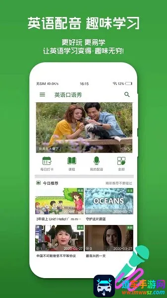 英语口语秀英语可以说“Oral English Show” 。如果你想提升英语口语水平,那英语口语秀app绝对是个不错的选择。它是一款轻松趣味又高效的英语口语学习软件。每日更新热门英语经典视频,通过为电影、动漫等视频配音,能让你忍不住开口说英语,不知不觉提高口语,掌握地道标准发音。这里有海量热门经典美剧、电影大片等你来配音,还有丰富的素材,像火爆带感的美剧、基情满满的英剧、流行动感的英文歌曲、不断更新的动漫纪录片等应有尽有。它摆脱了枯燥无味的传统学习方式,全新的模仿配音、生词翻译、作品分享模式,让你随时随地玩配音学英语。还有精心打造的移动英语微课堂,为你量身定制系统化课程,在线外语名师24小时答疑。有了它,学习英语不再是难事,轻松就能提升口语水平啦。
