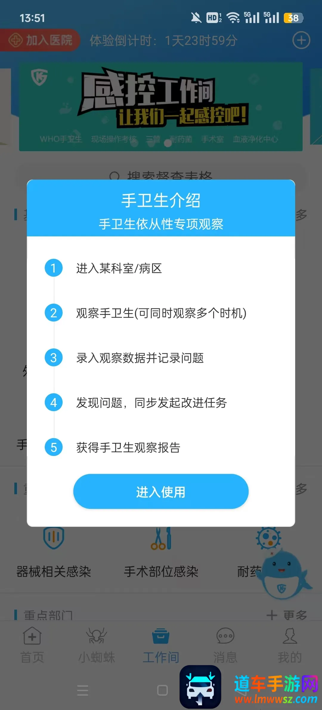 感控工作间是一款超棒的医院感染管理移动工作间软件。它能轻松解决医疗机构督导问题,减轻督导人员工作压力。这里有大量学习手册知识和公开课,方便学习机构制度。它的功能很强大,能实时监控病人感染动态,云端数据共享支持多部门协同办公,还有感染事件预警。发布考试也不难,首先进入小蜘蛛页面,接着点击在线测评,然后点击练习,勾选专业分类,继续点击选择完毕,开始组卷,之后选择答题模式开始答题,完成20道题后可查看题目解析。它还完善了定时定内容定岗位学习考试功能,有PDCA持续改进循环功能,能自动统计识别感控风险,新增全院院感督查指标库,协助医院快速建立质控评价体系,真的很实用,能满足医院感染防控多方面需求,强烈推荐!