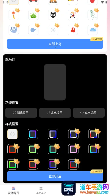 灵动屹小组件优势显著。它是集通知增强、桌面美化与效率工具于一体的实用应用。能将重要消息置顶悬浮,提升信息处理效率。支持多场景跑马灯特效自定义,充电来电消息提醒有专属灯光效果。提供丰富个性化组件与壁纸资源,可自由组合搭配,打造专属美观桌面。内置番茄专注计时功能,助用户高效管理时间。软件整体轻量化运行,占用资源少操作流畅,兼顾实用与观赏,满足多种需求。