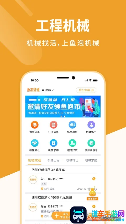 它的特色也不少,支持地理位置定位,按城市推送附近设备。能智能推送求助信息,闲置设备可借此赚收益。可按类别筛选设备,转让设备也能在线发布信息促进成交。总之,鱼泡机械网能满足你在工程机械租赁方面的各种需求,超方便!