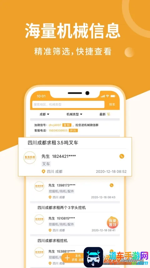 1. 信息推荐智能:能根据城市位置推送附近机械设备,还会智能推送最近发布的求助信息,让您轻松把握各类商机,赚取租赁收益。