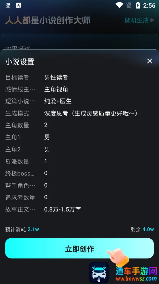 AI小说创作大师是一款超棒的人工智能写作创作辅助软件。它能解决写小说的诸多难题,功能超强大!输入核心设定就能生成完整大纲,还能自动拆解为章节计划。能校验设定避免冲突脱节,有题材定制、设定生成等实用功能。使用时,首次打开先确认用户协议与隐私政策。然后在创作界面输入故事描述,选好参数点击下一步,在小说设置界面确认信息后选生成模式就能立即创作。登录可领万字礼包,攻略板块能学习创作到变现的全链路指导。软件优势明显,有实时资讯、变现指南、趋势预警等。智能灵感超厉害,输入关键词就能解锁多元创意。它适合写作新手、日更作者等,能免费使用生成,能让写小说变得轻松又高效,赶紧试试吧!
