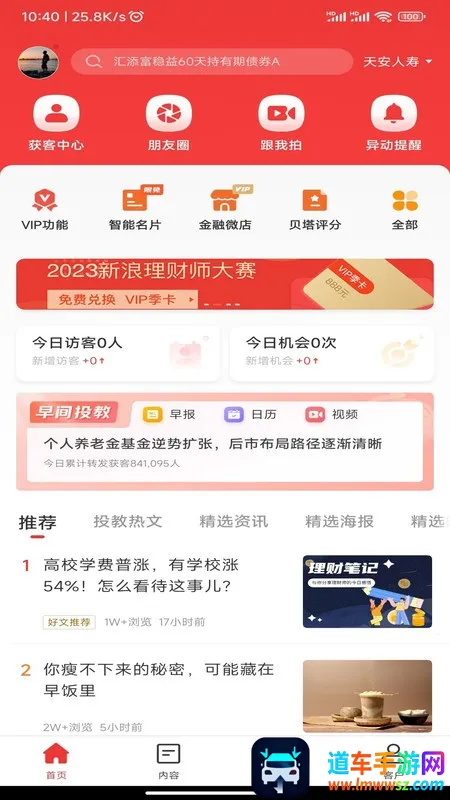它提供全市场金融产品可视化查询,涵盖私募、信托等多种类型,方便理财师为客户找到合适产品。还能实时追踪客户营销线索,挖掘潜在客户。入驻的金融专家可帮助解决财经专题文章,提供有用信息。能自动为金融产品评分并生成报告。平台推送的财经早报全面详细,便于及时接收重要财经动态。