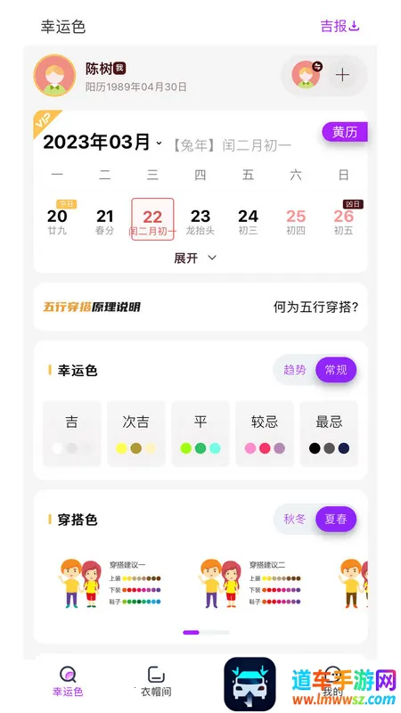 1、结合五行命理:依据每日五行属性搭配当天最适宜色彩,还可根据个人生辰定制每日穿搭宜忌和幸运饮食推荐,通过五行穿衣指南调节自身能量及气场,实现天人合一,让好运连连。