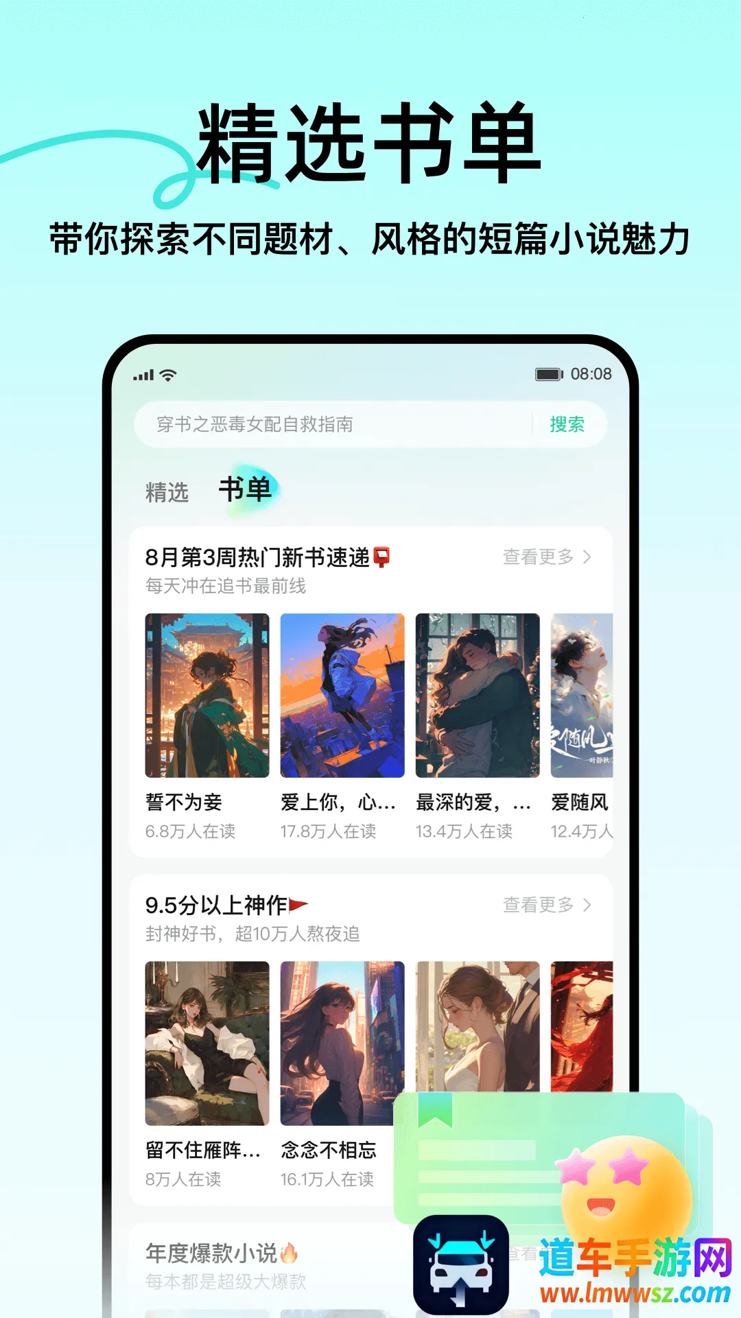 1、海量精选:涵盖言情、悬疑、科幻、治愈等多种题材,海量精选短篇小说,随时随地沉浸精彩故事世界。