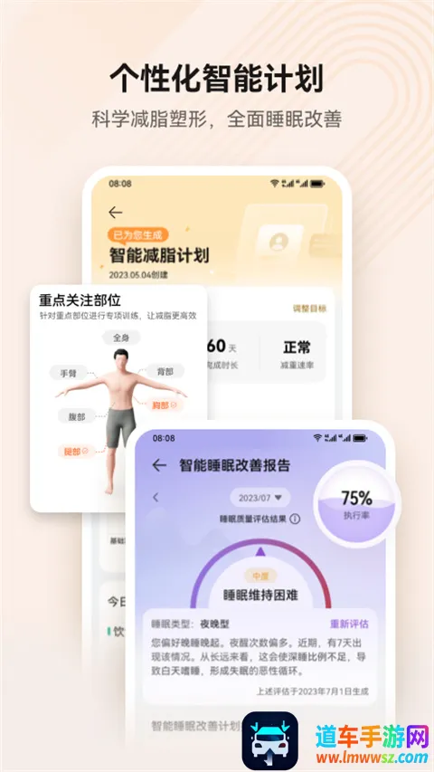 2. 全面健康监测:不仅能追踪运动,还可实时跟踪心率、体重、体脂等关键数据,结合科学睡眠评估,精准监测入睡、深睡、浅睡等阶段,提供个性化健康管理建议。