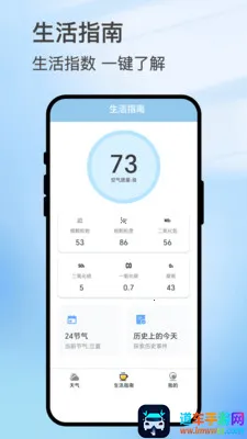 2.在生活指南页面,展示了空气质量参数信息,秒速对比,还有节气和历史事件查询功能。