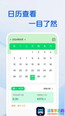 3. 查看便捷体验好:日历视图记录工时,加班情况每天清楚显示,支持人工修改加班时长,打开软件就能看到完整工时情况,不用再翻表格核对。