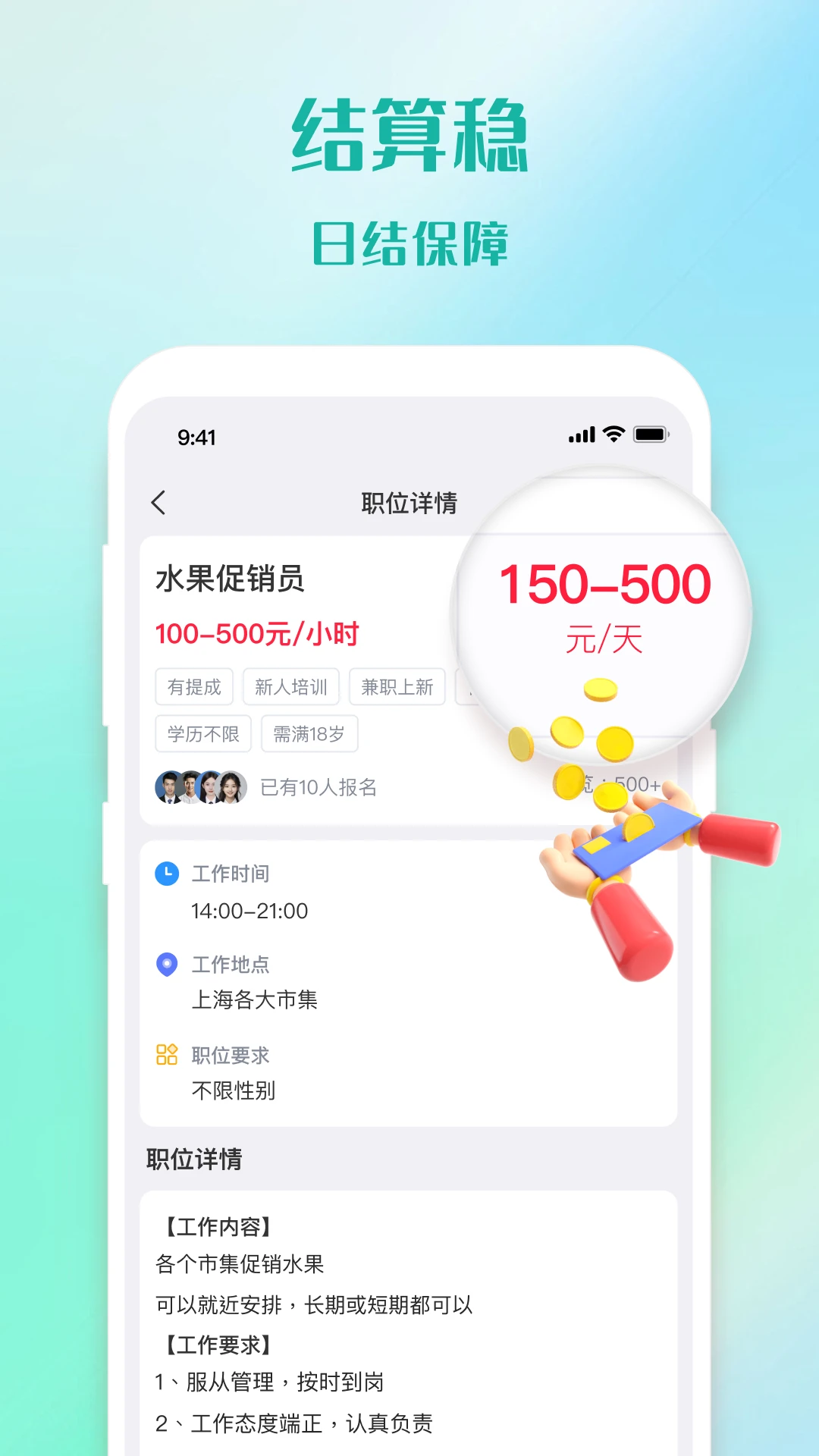 4、工作自主灵活:提供大量稳定的短期岗位,能自主安排工作时间,不受固定工作时间束缚,充分利用空闲时间赚取零花钱。