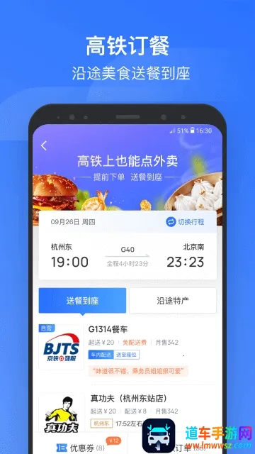 3. 丰富服务聚合:涵盖高铁订餐、极速打车、余票查询、自驾租车等,满足出行各方面需求,如高铁车站沿途美食一网打尽,聚合打车告别高峰打车难。