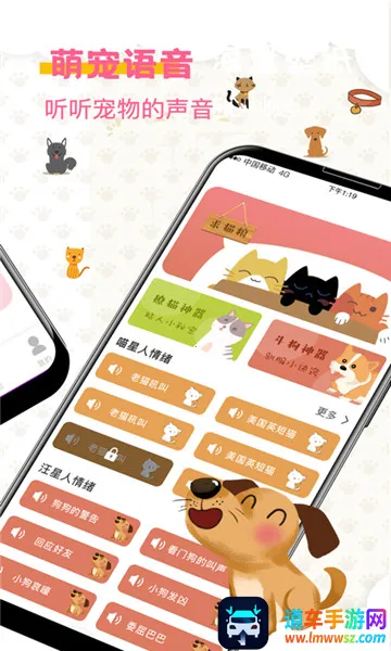 2. 语言翻译:凭借对超100只狗狗猫猫的1000个高品质采样,可分析你的语音并复述变声的猫狗叫声,还有带多种宠物叫声的音板,支持所有猫咪狗狗品种语言翻译。