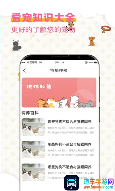 3. 爱宠知识:能帮助你了解爱宠心情。主界面切换至逗乐专区可查看驯犬技巧等;进入百科页面可浏览养宠文章,掌握犬类知识,更好地与宠物互动。