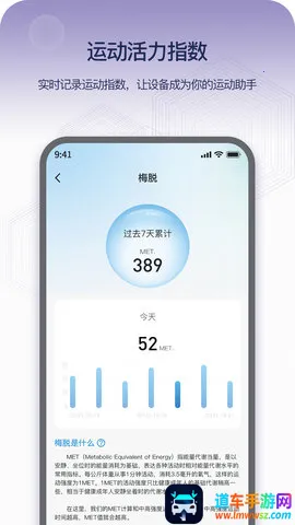 3. 可记录每天的睡眠情况,包括深睡时间、浅睡时间等睡眠状况,以及每天的MET.指数,鼓励完成每天的运动量。