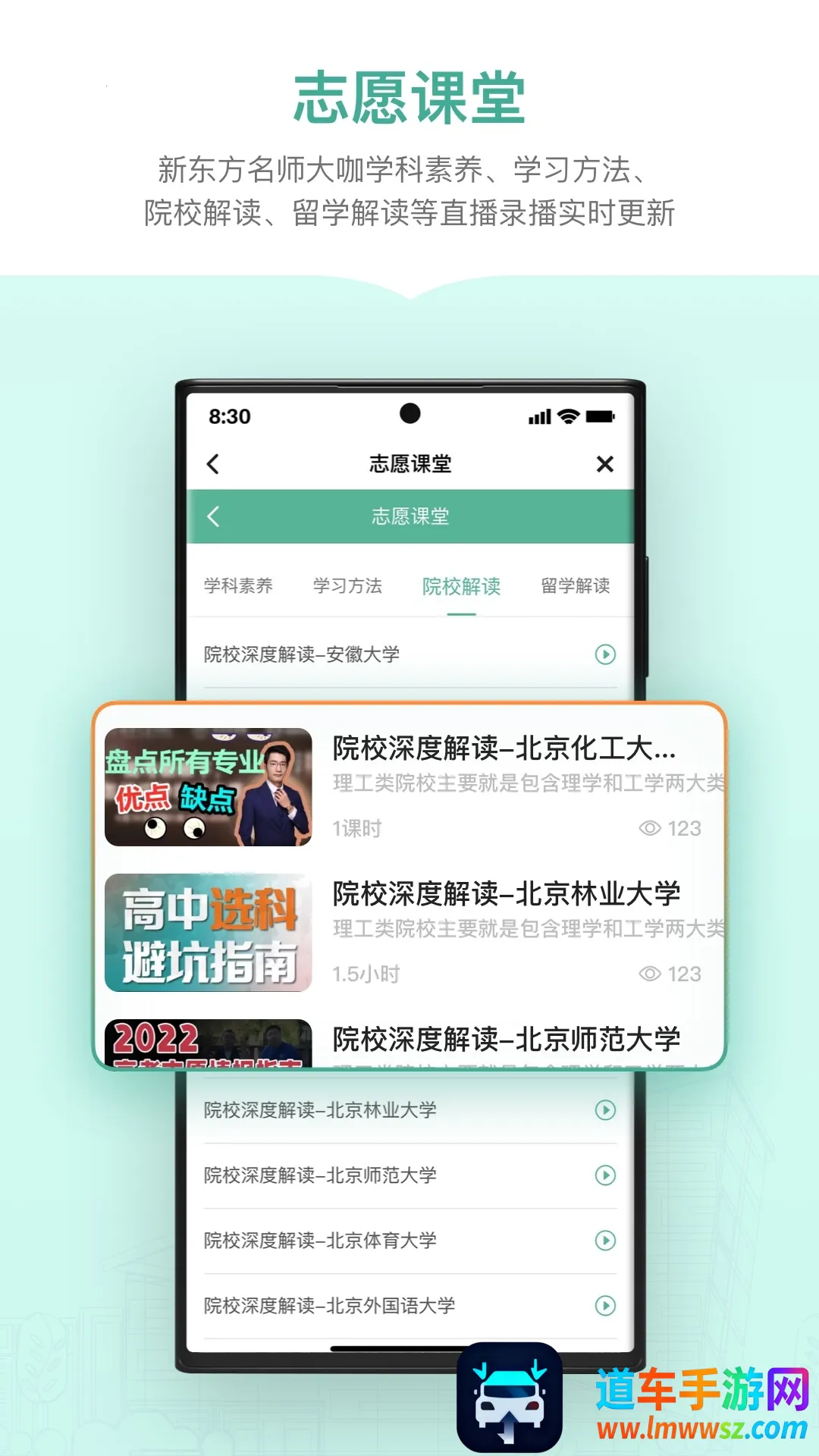 3. 志愿课堂丰富:有新东方名师大咖的学科素养、学习方法、院校解读、留学解读等课程,实时更新,助考生全面了解院校及专业情况,更好制定升学计划。