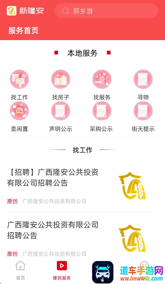 功能全面实用:涵盖新闻资讯、政务服务、便民板块、媒体聚合、社区交流等功能,聚合招聘求职、房屋租售、街天信息等高频需求,整合隆安电视台、隆安日报等资源,内置专属互动社区。