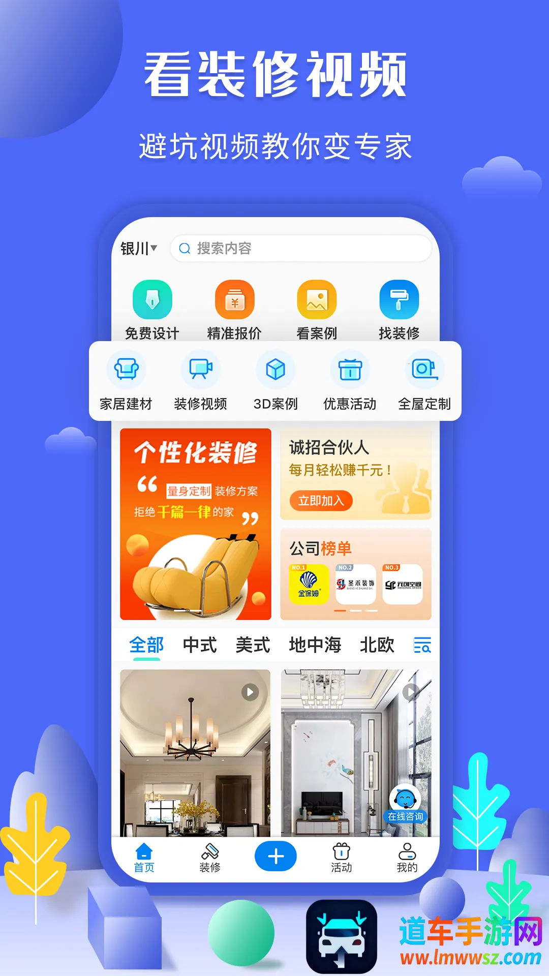2. 海量装修案例任你选:3D全景效果图,可按面积、户型、风格等条件筛选理想装修设计,让装修更省心。