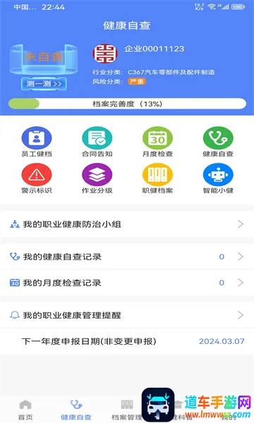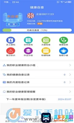 职健通是一款专为企业员工打造的健康管理软件。它能帮企业建立职员全面健康档案,涵盖个人基本资料、工作经历、体检记录、疾病历史等,并进行管理。可根据员工身体状况制定多样健康管理方案,还能进行个人健康素质评估。软件亮点多多,能让企业了解员工健康素质和数据信息,确保员工身体健康。通过平台分享健康小知识,员工能学习基础健康常识和护理方法。员工可登记信息,方便企业后台查看。其优势在于创建健康社群,员工能交流心得;打开健康问卷调查可进行健康评估。有了职健通,企业能降低职业病风险,保障员工健康安全,提高职业健康管理水平,全方位守护员工健康。关于职健通发的证书,通常只要是按照正规流程和规定获取的,都是有效的,能为员工的职业健康管理提供有力的证明和保障哦。