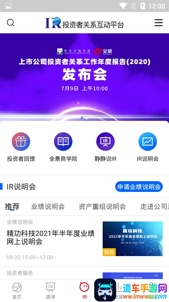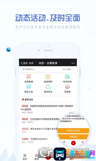 全景路演app是一款超棒的财经路演服务软件。它能帮投资者获取更多行业资讯。这里认证用户多,有上市公司、新三板企业、中小企业等,覆盖各类机构群体和专业人员。多角色用户界面不同,权限灵活配置。能精准对接项目需求,中小企业可发布找融资需求,上市企业能找并购标的,48小时联系投资机构。平台有6类活动及项目信息,不同用户看到的有区别,可报名提问互动。还能精准邀请用户参与活动,根据用户设置建立数据关联。特色是能按设置精准找圈内资源,每日更新动态,方便推广项目,搭建沟通桥梁,实名认证保障交易安全,分类检索资源不迷茫。亮点有提供机构交流场所,电话会议功能强大,全领域动态资源,多种活动类型可参与,能主动邀约分享项目信息,让找投融资项目更便捷。