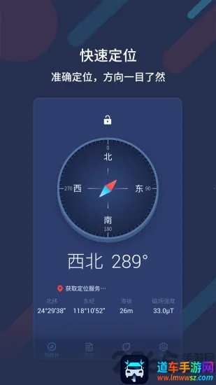 1. 定位精准:基于GPS定位与传感器技术,实时显示地理位置、经纬度、方向、东南西北及磁场强度,确保方向指引准确。360罗盘旋转刻度设计,界面简洁直观,快速上手。