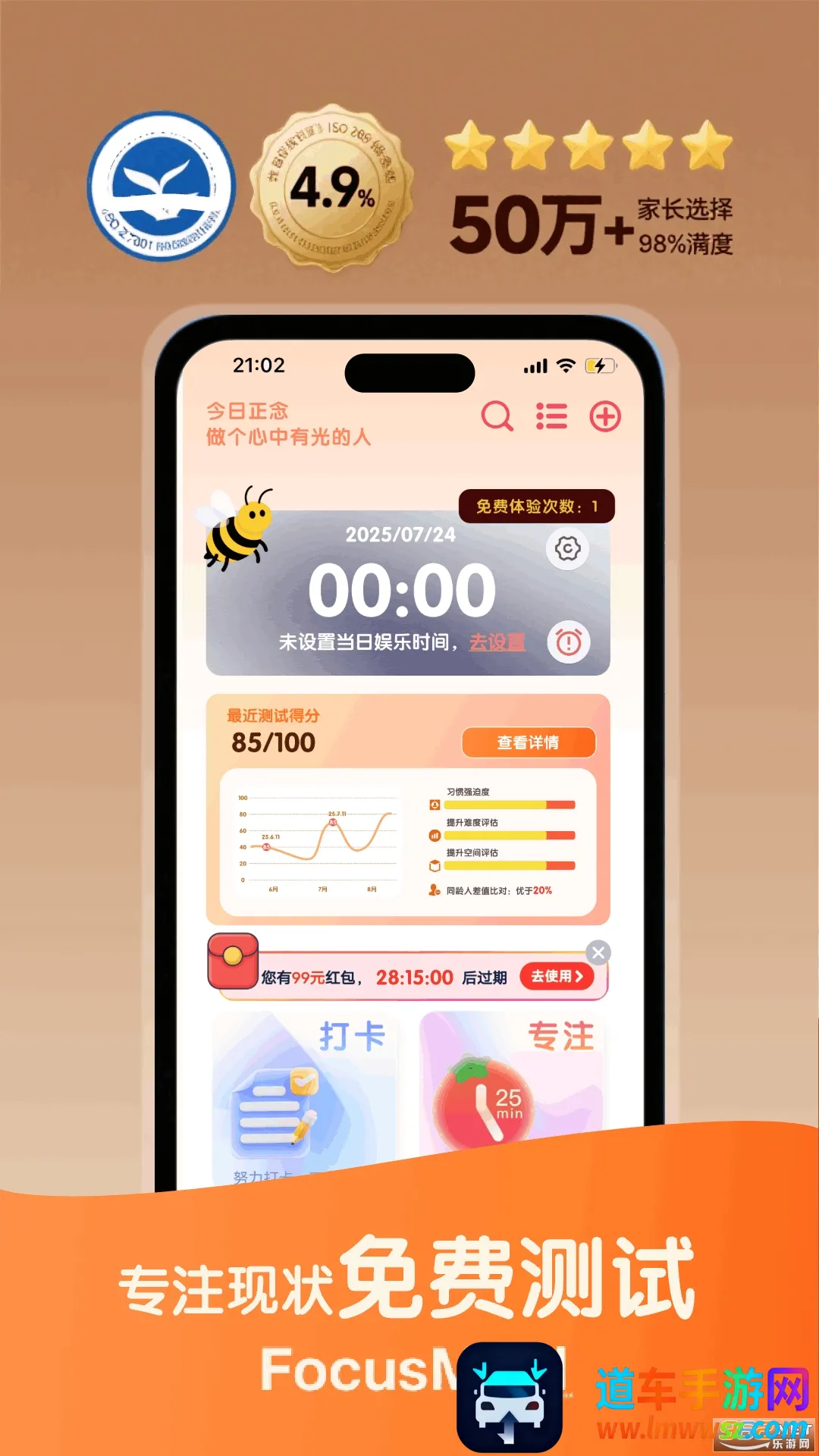 蜜蜂专注是一款助力提升专注力的科学工具。针对孩子刷短视频成瘾、成人无意识刷娱乐软件等问题,它通过画像测试找根源,为不同人群定制专属提升方案,帮你和孩子摆脱手机诱惑,重获专注力。