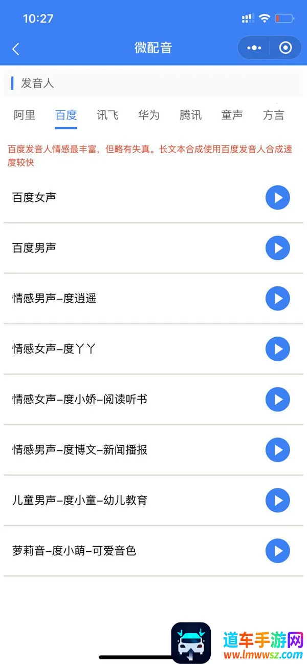 想知道微配音选哪个男配音员好?微配音这款手机应用能帮到你!它专为音频爱好者打造,不管是制作有声小说、语音广告,还是录制音频日记,都能满足。这里有丰富音效库和多种调音工具,操作超简单。打开软件,在输入框输入文字,最长能输10000字,还能插入停顿、选文本范例。能轻松选择发音人,调节语速、音调、音量,也能选背景音乐并调音量。设置好后点击语音合成就能生成播放配音,满意还能导出。它有60个AI情感发音人,融合三家语音合成优势技术,情感发音人朗读效果堪比真人,还有童声、英文、方言发音人等。海量配音素材,各类大咖真人主播聚齐,能满足制作视频、编辑视频等多种场景需求,让你轻松找到适合的男配音员,制作出满意的配音。