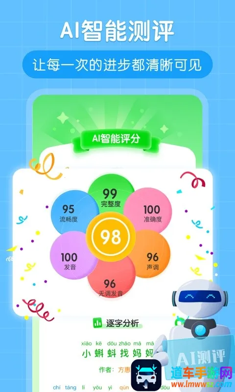 3. AI智能评测:通过语音识别技术对朗读作品的完整度、流畅度、准确度、声韵声调等精准评测,让进步清晰可见。