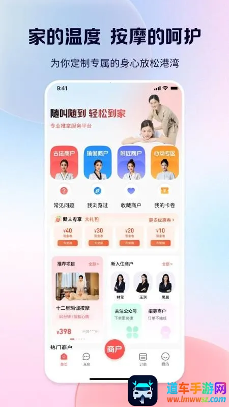 轻松到家是一款提供上门按摩服务的平台。它能根据用户手机定位精准推荐附近商户,方便查找下单。支持多类型商户服务预约,带来多样选择。新人有优惠福利,省钱消费。还可实时跟踪订单全流程。在这里,用户能享受到省心高效、便利生活的体验。专业技师提供专业服务,经过资质认证,让人放心。热门商户优先推送,可优选下单。品质服务带来高品质生活体验。比如忙碌一天后,在家就能轻松预约专业按摩,享受惬意时光,让生活更便捷舒适,是个不错的选择。
