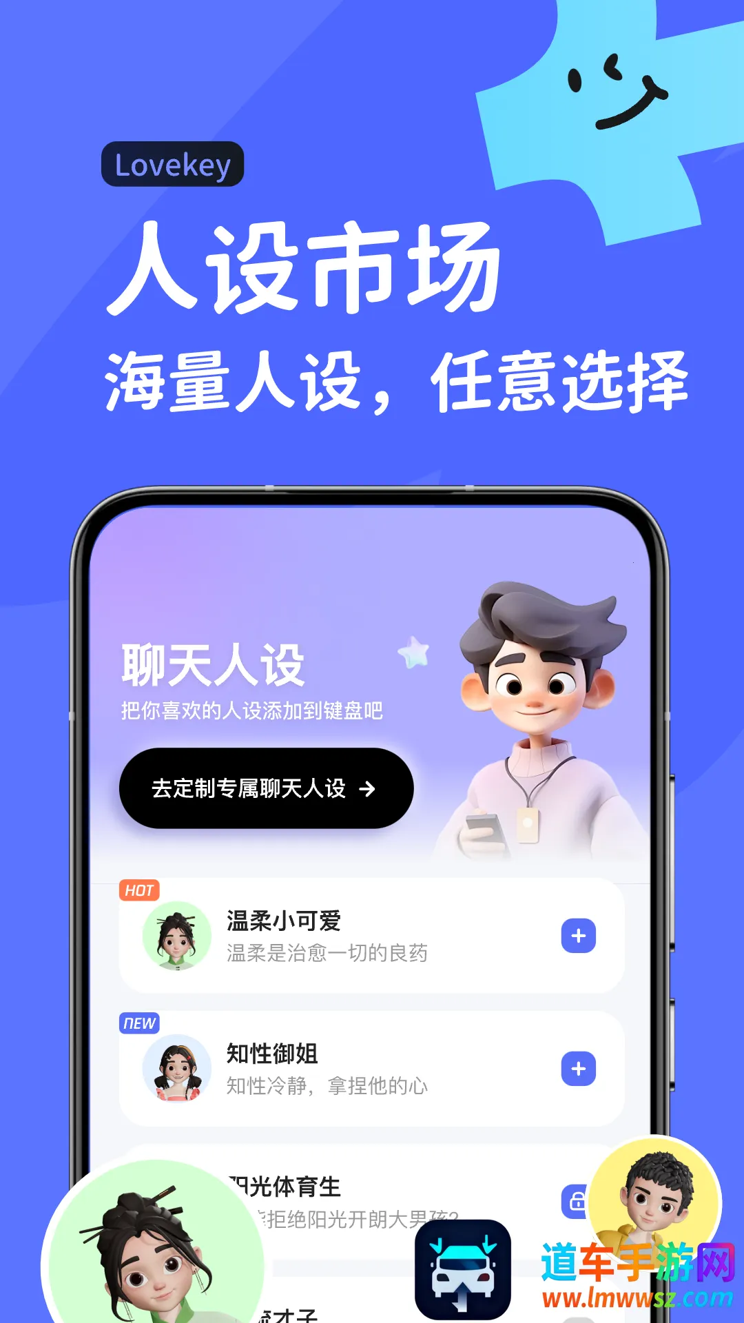 Lovekey键盘是苏州猜猜看科技有限公司开发的输入法软件。能智能回复、有多样场景,还有丰富表情贴图。可调节聊天亲密度,提供海量聊天人设,支持多语言,操作简洁,免费无广告,让聊天更轻松有趣。