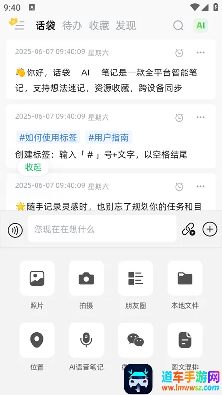 话袋2026官方最新版本优势显著。它**1秒打开无广告**,打开即可记录,毫无负担。支持app端、电脑端、web端及插件等多端同步,随时随地都能查看和记录,即便没网也能使用。借助AI问答助手,能获得即时笔记反馈,让记录不再沉闷。还可将各种链接、图片、文本一键集中收藏到话袋,方便整理。无论是日常灵感记录,还是知识管理,都能轻松应对,为用户带来便捷高效的体验。