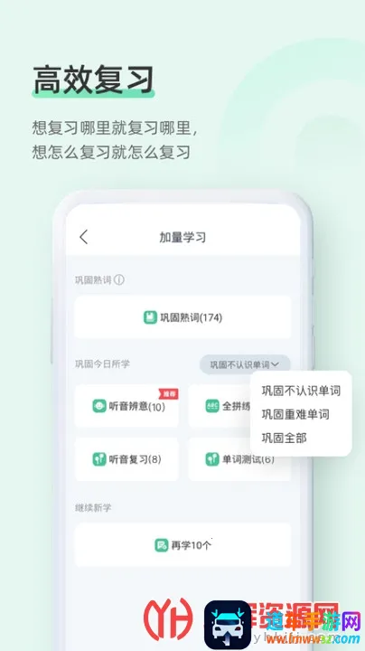 2. 智能制定学习计划,按遗忘曲线和学习进度自动安排复习,提供多种学习方法全方位加强记忆。