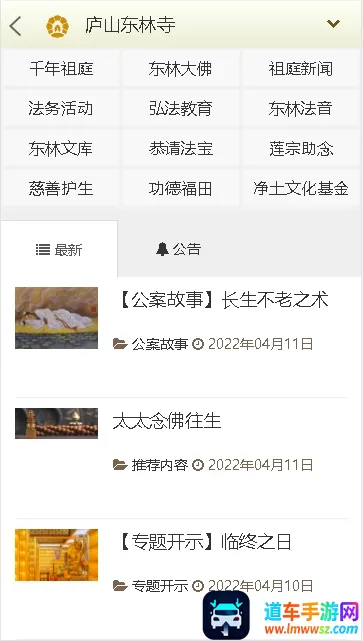 东林祖庭最新手机版是聚焦汉传佛教净土宗文化的生活应用,为佛学爱好者等提供学习交流平台。涵盖祖庭动态、经典学习等多维内容,有丰富视听资源,还有文库、恭请法宝等特色板块,助您随时学佛法。