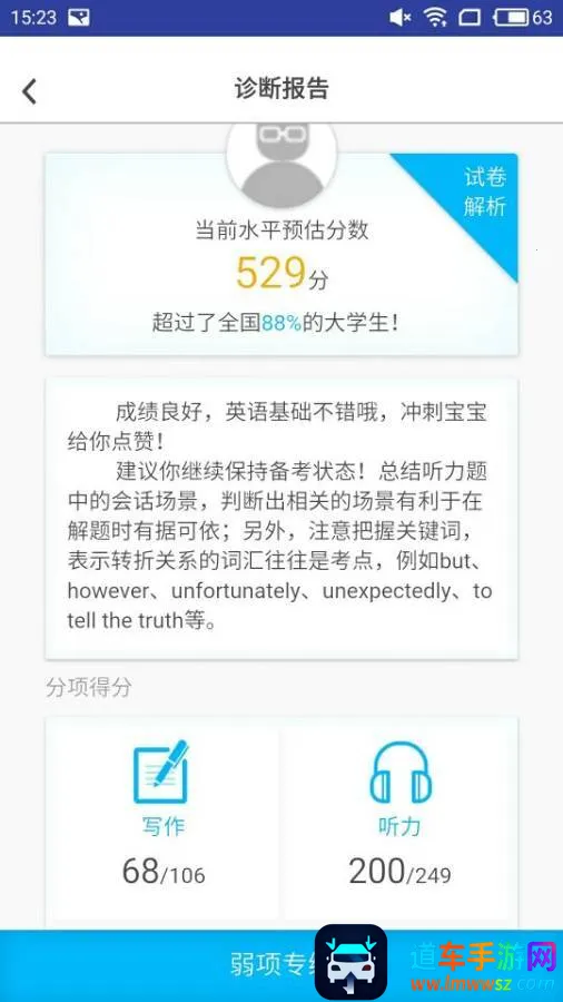 四六级冲刺宝简直是备考四六级的神器!它功能超强大,能帮咱解决不少难题。有模拟考试功能,口试笔试都能模拟,提前熟悉流程,还能综合诊断能力。智能推荐会根据个人水平推送专项训练,直击弱点稳步提升。视频课程有众多名师精品课,在线就能轻松观看,助你备考。高分攻略里的优质文章攻略和提分秘籍,考前看看很有用。自主培训有海量题可练习。它的手机版特色也很多,能全方位训练听说读写,涵盖不同场景。遇到问题能随时在线答疑,还有课程回放可巩固知识。能制定和跟踪个人学习计划,还能分享学习资料。有了它,随时随地都能针对性学习,高效备考四六级,轻松解决备考难题,强烈推荐给正在备考的同学们!