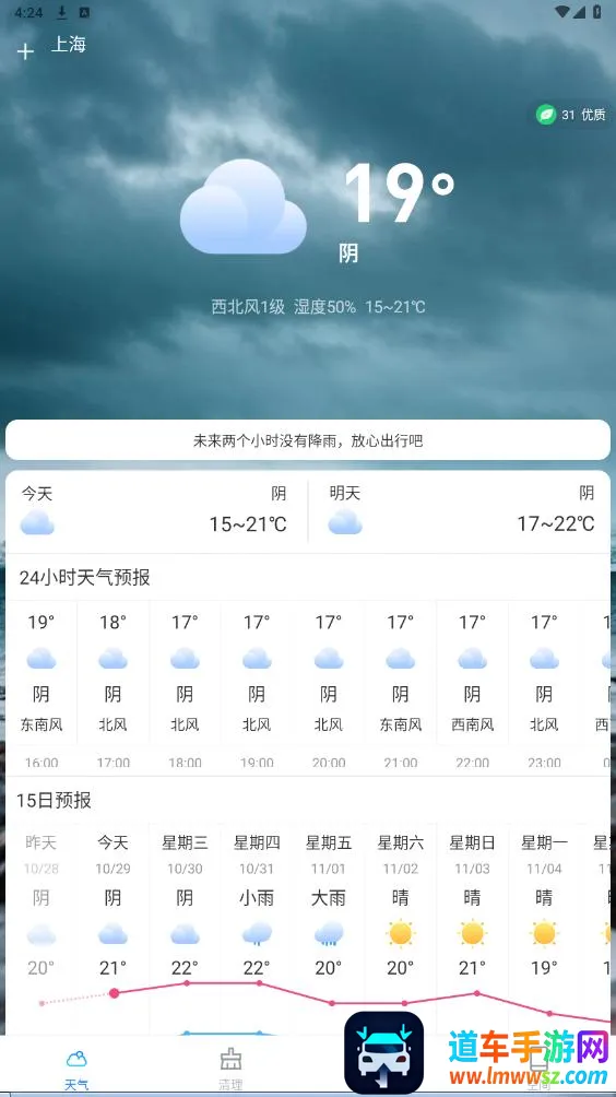 界面设计简约清新,背景会随天气变化。还具备多种实用小工具,如查看日历、每日忌口、运势等。总之,云幻天气功能全面,方便实用,值得一试。