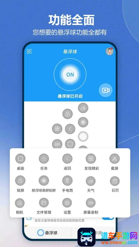 万能悬浮球是一款超棒的手机辅助工具软件!它能极大提升操作效率。屏幕上方有个便捷悬浮球菜单,常用操作一键搞定,像返回桌面、切换应用、调节音量、打开手电筒等。单手操作或有障碍时用它超方便。它高度自定义,位置、样式、功能模块都能按个人需求调整。运行稳定不占资源,适配多种安卓机型。软件特色满满,有一键返回桌面等快捷操作,支持自定义大小、透明度、颜色主题,内置手电筒等丰富插件,还有小工具箱整合闹铃等小玩意。亮点是一键设置操作轻松,比苹果小白点漂亮,可藏在通知栏不影响游戏视频。优势在于能灵活定制悬浮板及按键功能,有丰富主题。总之,它免费易用又实用,赶紧下载试试吧!
