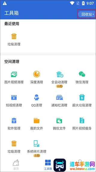在工具箱界面右上角找到并点击【回收站】图标。