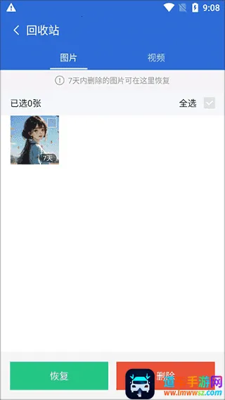勾选需要恢复的图片或视频文件,确认无误后,点击下方【恢复】按钮即可完成还原。
