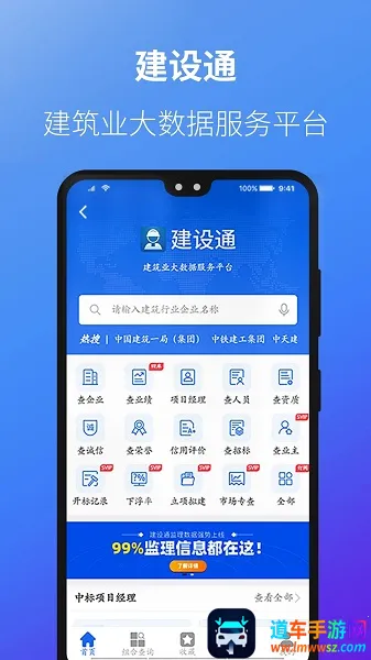 建设通是一款超实用的建筑业大数据AI服务平台。它能提供全国建筑企业的中标业绩、诚信信息、建造师在建、企业荣誉、资质等级、业主商机、项目商机等多维度查询服务。不管你是在开标现场、工地,还是出差途中,都能随时随地查询建筑企业相关信息。它能帮你快速了解企业实力,筛查诚信可靠的合作伙伴,分析潜在竞争对手,提高投标效率。还能智能推荐经营市场,匹配投标资源,助力企业持续发展。有了它,建筑行业人士查询各类信息都方便快捷,能轻松把握行业动态,做出更明智的决策,真的是建筑行业人士必备工具!